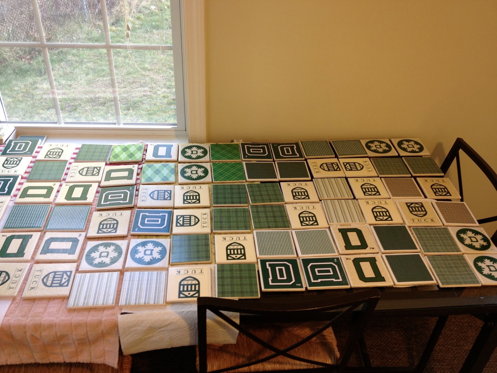I thought about making these tile coasters...but I tried to think about what I could do to make them unique to the community and to all of our Tuck people...I thought "I wonder if I could put the Tuck and / or Dartmouth logo on them." I sent some emails to some people at Tuck and got in touch with the woman in charge of the licensing at Dartmouth. It was a simple meeting, and license agreement, and I was on my way. She sent me logo's to use, and let's just say that it was well worth all the work. Although my kitchen looked like this for... well...a while...It was a lot of fun for me to have a crafty project to work on after the kids were tucked in for bed. I stayed up WAY later than I usually do for weeks on end, and was exhausted for most of the month of November...but like I said...it really was a lot of fun, and definitely worth it.